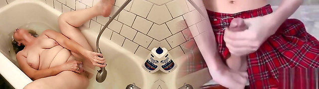 Stepmom masturbate front of his son when he was also masturbate in the bathroom