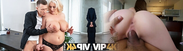 Pretty brunette cougar doesnt care much about paperwork, she needs her big tits pawed immediately