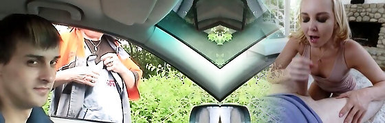 Mature long haired blonde seduced a teenager dude and gives him a hand job