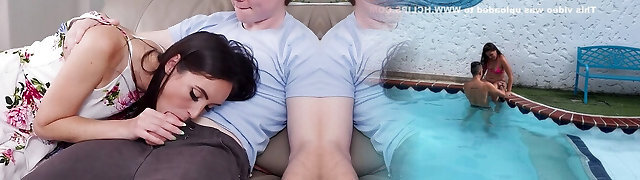 Big boobies teen shares big stiff hard-on with her horny step mom