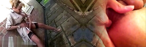 A blonde in a chic dress and red lipstick caresses her hairy puss through her panties