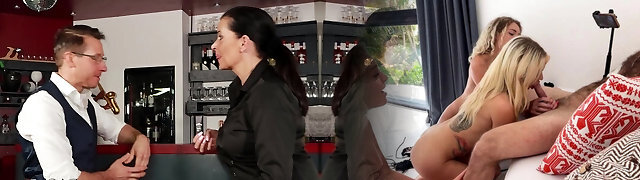 2 grannies share young cock in the MatureVan