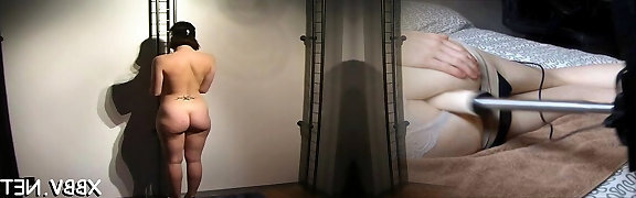 Nude wife stands tied up and endures heavy breast thraldom