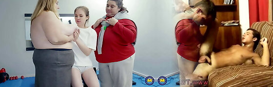 Very BIG BBW lesbians sharing young girl in gym