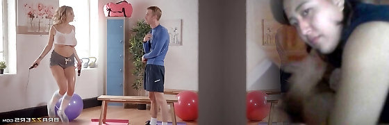 Mom and Teen have Anal Threeway Sex with the Coach at Yoga Session in Gym